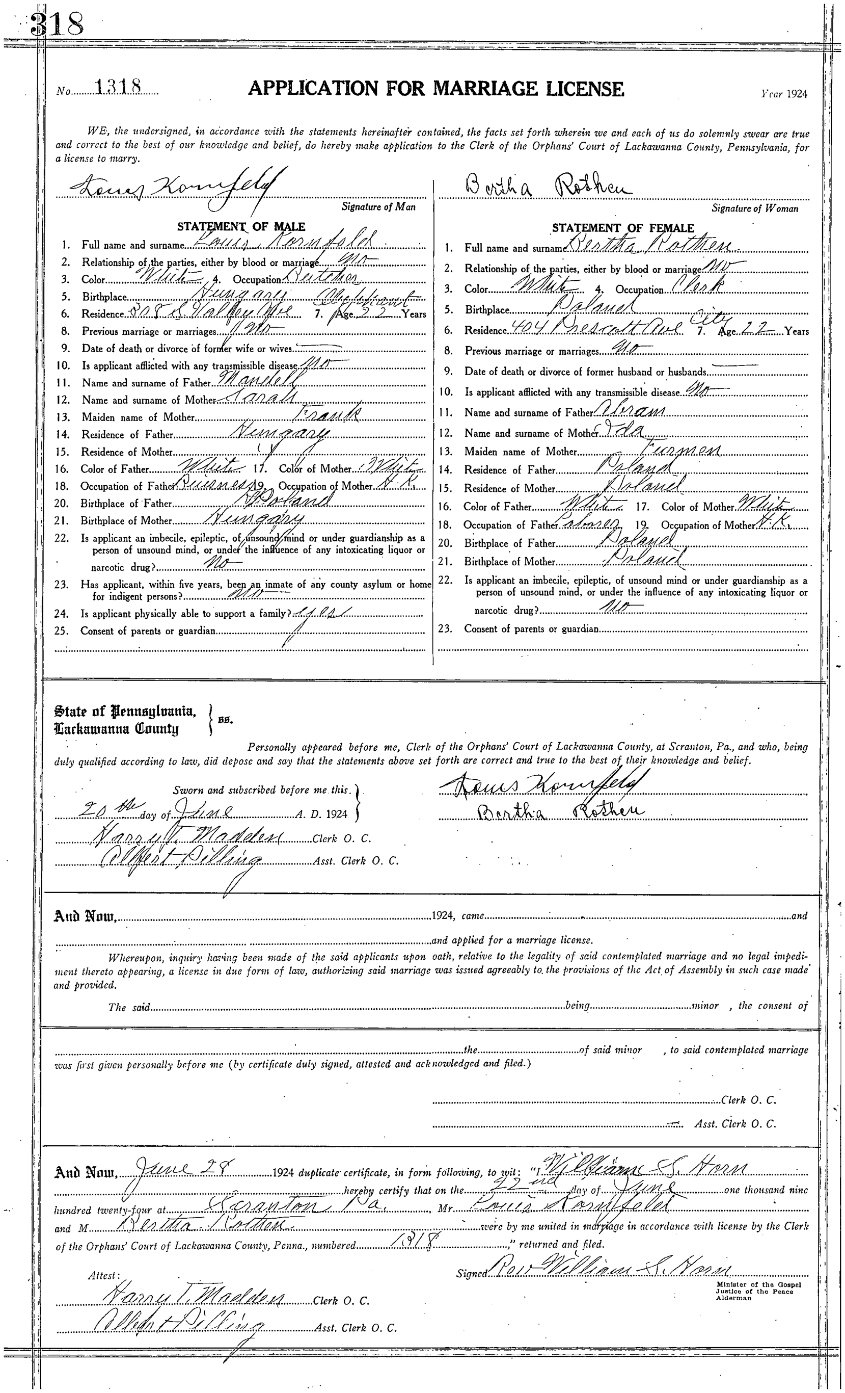 Below is the application for marriage license for Bertha Rothen and Louis Kornfeld filled out on June 20, 1924. Bertha signs her name and includes the following information about herself. She worked as a clerk, resided at 404 Prescott Avenue, had no previous marriages, and was 22 years old. She also provided the following information about her parents. Her father’s name was Abram from Poland and worked as a laborer. Her mother’s name was Ida Furman from Poland and she worked as a housekeeper. The wedding was officiated by Rev. William S. HORN on June 22, 1924 in Scranton, PA. Bertha consents to the marriage by stating “no” to “Is applicant an imbecile, epileptic, of unsound mind or under guardianship as a person of unsound mind, or under the influence of any intoxicating liquor or narcotic drug.” Bertha was far from. She had a very sound mind even until her death at the age of 99!