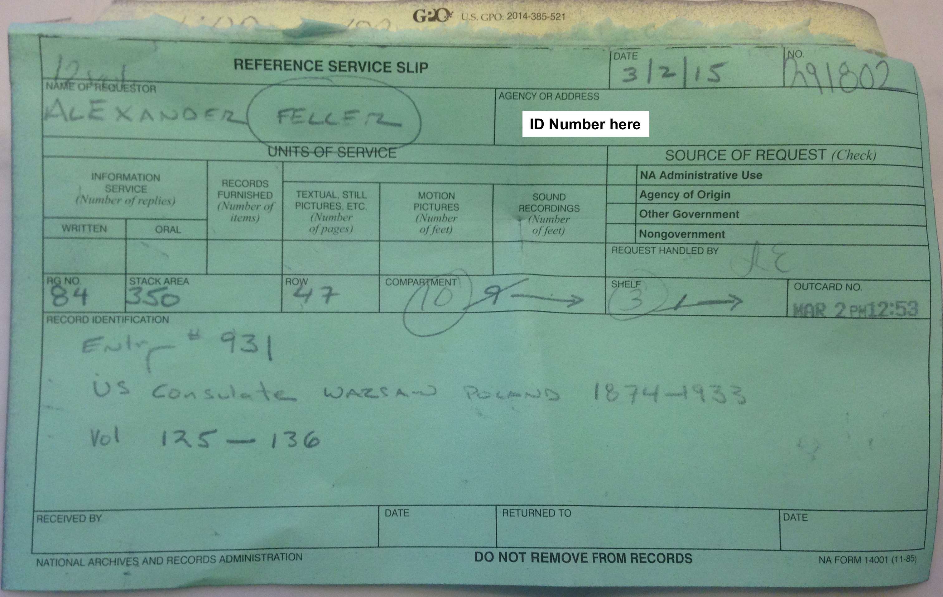 After signing in at the front desk on the second floor, I was shown to the research consultation room where 2 research consultants sitting by computers were available to assist.  I announced I was a newbie and needed help and showed them a copy of the email I was sent by the archive.  We started with RG84 and the consultant pulled a couple of binders off the shelves.  One binder was a filing manual which described the meaning of codes used in the finding aids of documents.  The other binder covered countries starting with the letter P including Poland, however, there were no records for Poland before 1940 in this binder.  I ended up pulling another RG84 binder off the shelf that covered the years 1930-1939 and found listings for the US Consulate in Warsaw.  Using the finding manual, I was able to narrow down on the files that might deal with immigration which happened to be labeled ‘Correspondence’.  Although the years only covered up until 1933, I thought I would give it a try.  I called for help to figure out how to complete a pull slip.  You need to write your name, date, and researcher number.  In addition to the document title, you also need to the write the record group, stack area, row, compartment, and shelf number.  The last four numbers are obtained from the finding aid.  I ended up requesting all volumes available in this group.