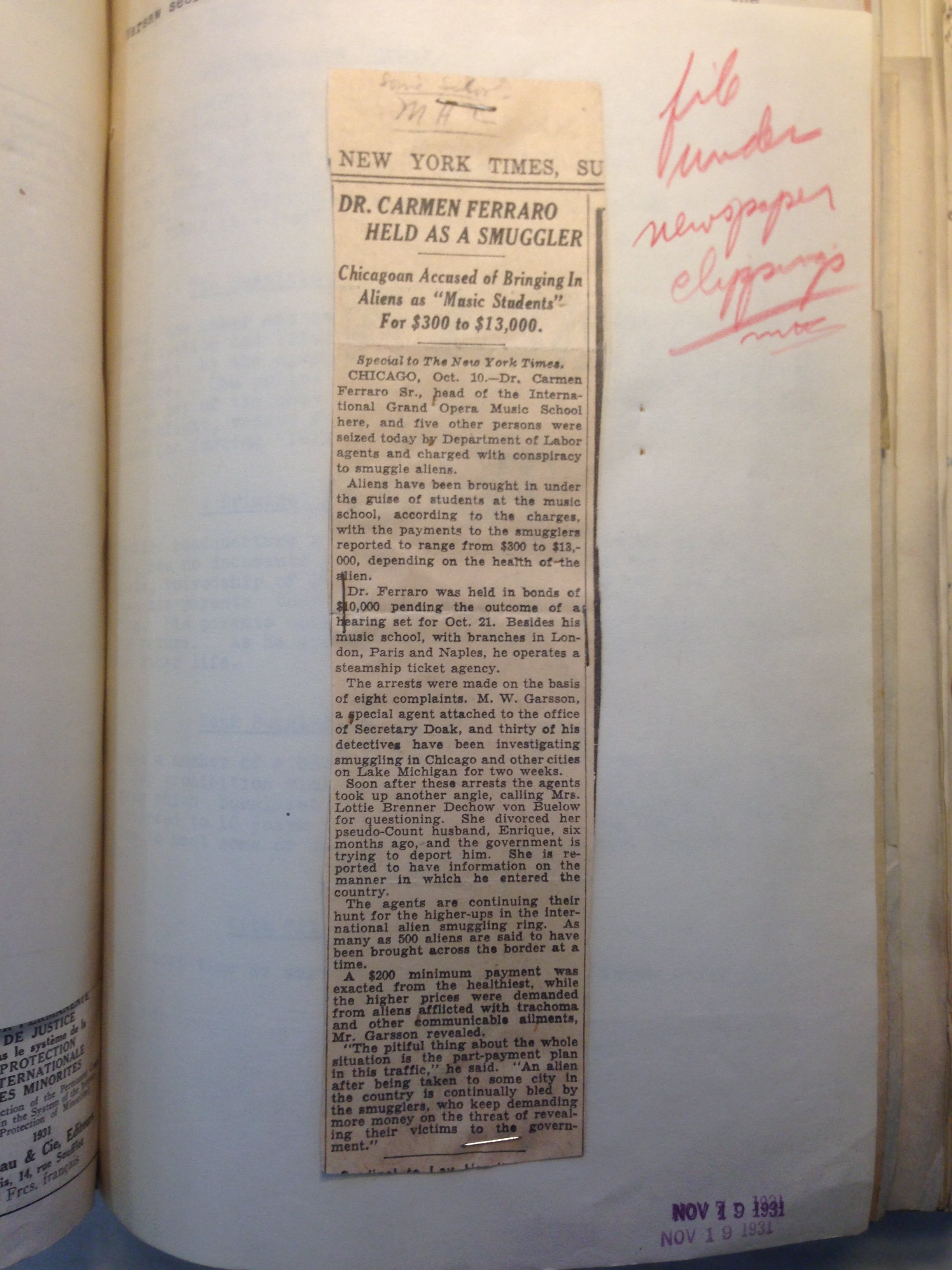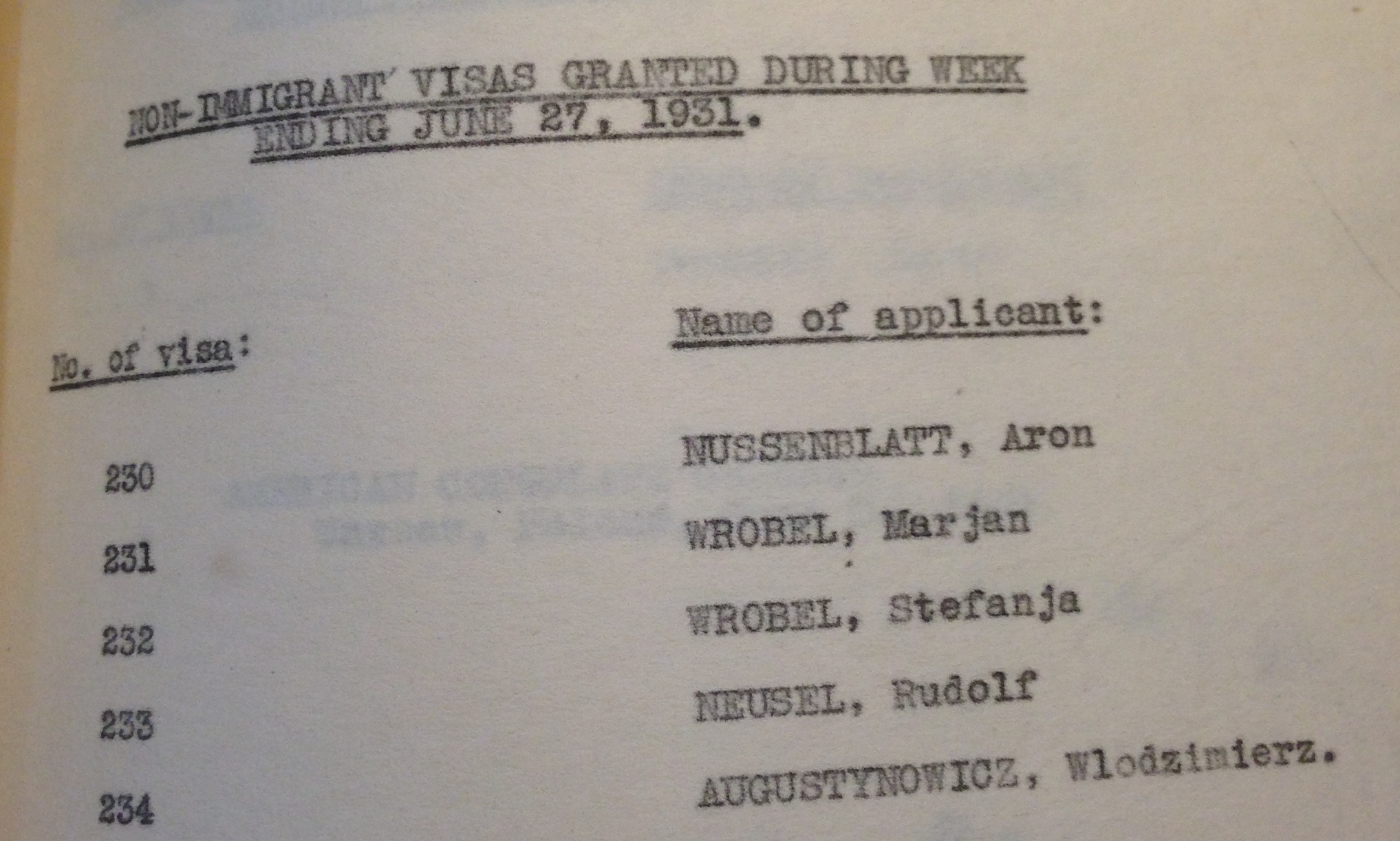 I will write about these records in a future post.  I used the copy machines to scan the records onto my flash drive.  I returned the visa file boxes and retrieved about 8 large scrapbooks of the US Consulate of Warsaw records.  Some of the books were still wrapped in plastic.  As time was running out, I quickly pick up an unwrapped one and thumbed through it.  It contained clippings from newspapers and letters from officials at home and abroad for more notable immigration issues. For example, there were documents related to charges against ‘alien smugglers’.  I also saw newspaper clippings related to the deportation back to Poland for a criminal who served time in Sing-Sing.  Of special interest to genealogists, there were also lists of immigrants’ names who were approved by the US Consulate and the date of their visa approval.