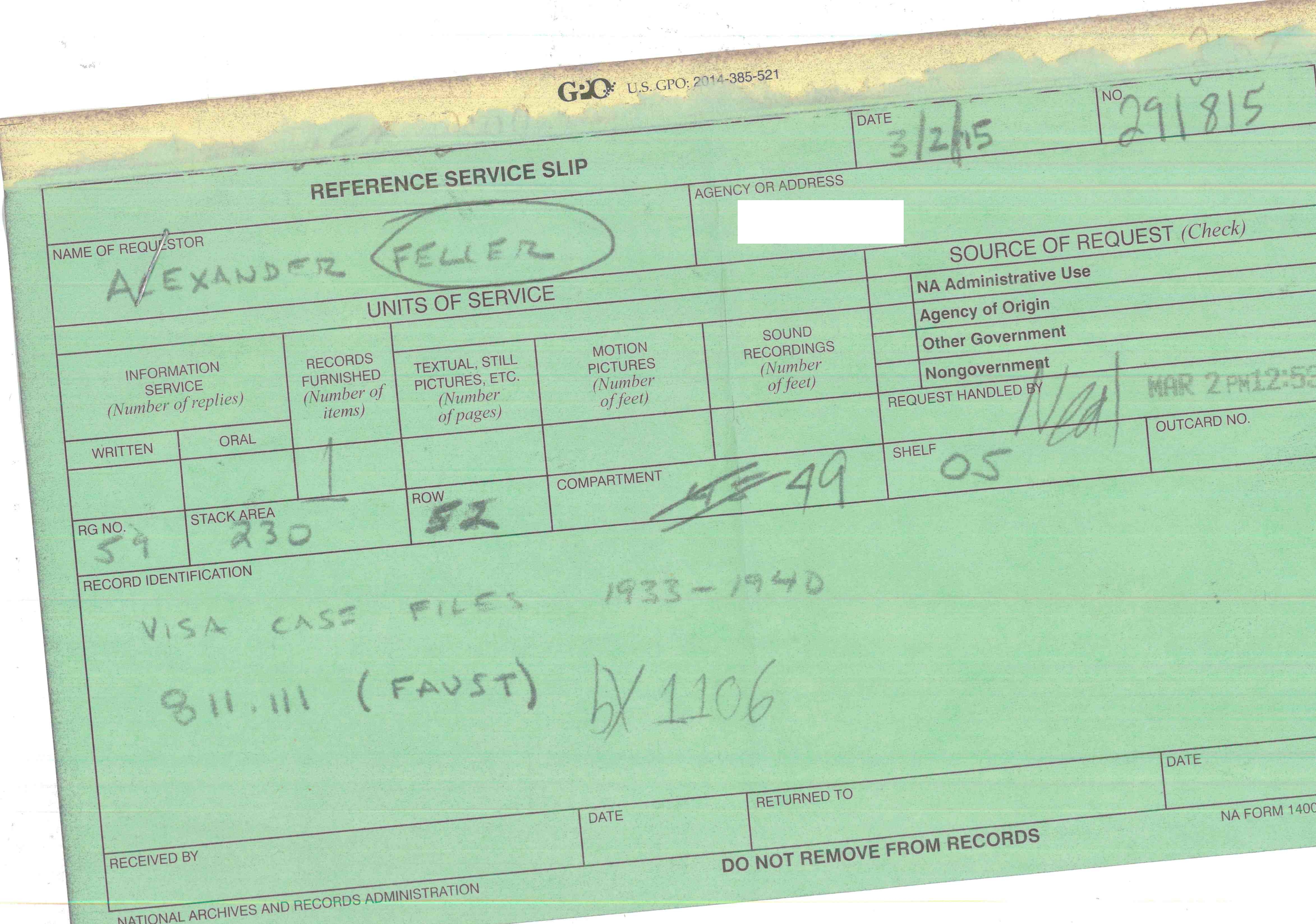 Pull Slip for Visa Case Files containing the surname FAUST.