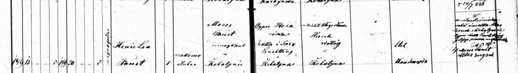 The choice of naming a child born during the 1800s in Rohatyn as Henie Lea occurred more often from members of the Faust and Schwarz families than any other families. Daughters born 1880 through 1900 to Perl Brandwein née Faust, Kalman Schwarz and David Schwarz were given the name ‘Henie Lea’ which suggests the naming connection is on Moses’s side of the family and further strengthens the probability of direct relation between the the Faust and Schwarz family.
