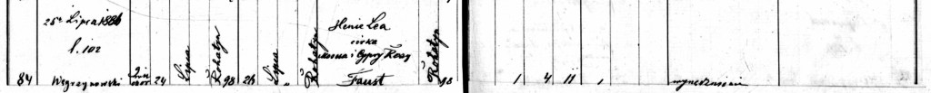 Henie Lea Faust died less than a month before her 5th birthday at 9pm on July 24, 1886 in house number 98 in Rohatyn. The body of Henie Lea was examined by Dr. Władysław Węgrzynowski on July 25th and assigned this death event as number 102. His diagnosis for the cause of death was given as emaciation (wyncędznienie) suggesting she suffered from a chronic illness or infection. Its possible she died of a gastrointestinal infection known as Summer Diarrhea (Letnia biegunka) caused by proliferation of bacteria in water and food due to lack of refrigeration and water treatment in the summer heat. Another cause of death could have been from Cholera which was highly prevalent during the summer months of 1886.