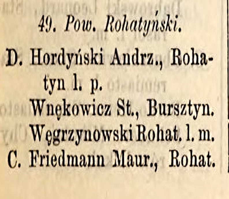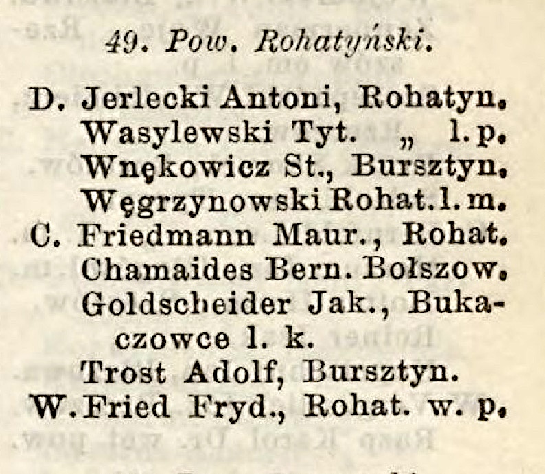 Dr. Władysław Węgrzynowski (4/3/1857-5/2/1895 Zbaraz) was a physician for the town of Rohatyn from 1884 to 1891. Listings in Kalendarz Lekarski show his name followed by the credentials ‘l.m.’ which is an abbreviation for lekarz miejski (city physician).