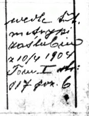 Written in the margin of the birth record for Izak Hersch’s second child is a reference to the date and location of his marriage record. The note states that Izak Hersch registered his marriage to Feige Sand on April 10, 1904 in Rohatyn. The record of this marriage was located in Volume 1, page 17, item 6 of the marriage registry for the Jewish community of Rohatyn. Unfortunately, this volume of marriage records is no longer known to exist. (Source: AGAD300/2461, page 270, item 60)