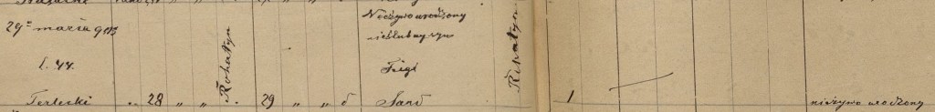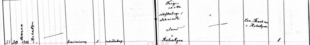 Prior to registering their marriage, Feige had delivered a male stillborn neonate with the assistance of midwife, Lea Barban. According to the birth record, the stillbirth was delivered on March 30, 1903. However, the death record for the stillborn states the death occurred March 28, 1903, two days earlier than what is recorded on the birth record. Dr. Terlecki certified the cause of death as stillborn (nieżywo urodzony) on March 29th, the date the stillborn was buried in Rohatyn. It interesting to note the difference in dates between these records. One would think that the recording of this event would have taken place on or very close to the date of the event as there would not be confusion. I am open to thoughts on the reason for this discrepancy.