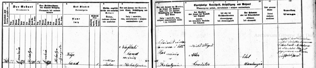 Feige Sand was the daughter of Naftali Sand, a butcher (rzeźnik), and Scheindel Has, the daughter of Samson, also a butcher, and Etti Has. Feige was born less than a month after Izak Hersch on December 22, 1878 in house number 201 in Rohatyn with the aid of midwife Etel Wandmeyer. Her blessing, given by the same Alter Lewinter who attested to her future in-laws marriage, occurred on December 28th at the synagogue. Samson Silberdrath of Rohatyn served as a witness to the marriage of Feige’s parents and signed the birth record in attestation thus labeling the union as ‘supposedly married’ (rzekomo ślubne) and giving assumed legitimacy to the birth.