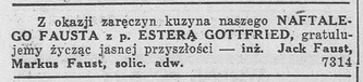 “On the occasion of the engagement of our cousin Naftali Faust to Ester Gottfried, we congratulate him and wish him a bright future – Eng. Jack Faust, Markus Faust, solicitor attorney.”