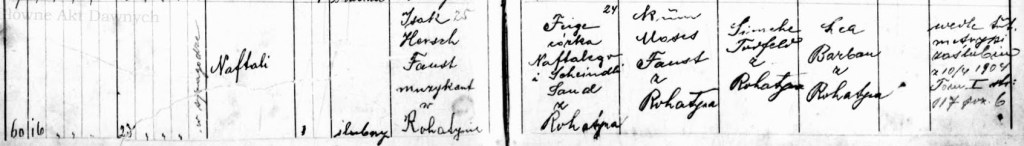 Izak Hersch Faust was born on Sunday, November 24, 1878 in house number 98 in Rohatyn to Moses Faust and Cypre Rosa Leuchtling with the assistance of midwife, Etel Wandmeyer. The parents were noted to be ‘supposedly married’ (rzekomo ślubne) thus the birth was given the benefit of the doubt on legitimacy and Isak Hersch was named with the Faust surname. Alter Lewinter attested to the marriage of Moses and Cypre Rosa and signed the birth record. Moses Faust signs his name twice, in Hebrew and in Latin letters. The brit milah ceremony was held the following Sunday on December 1st at the synagogue. Moses’s brother, Markus, a musician as well, was the Sandek, and Leib Schächter was the Mohel. Izak Hersch was named after his maternal grandfather, Izaak Hersch Leuchtling.