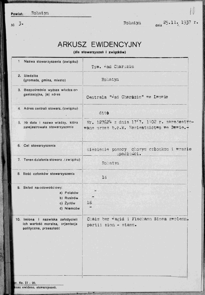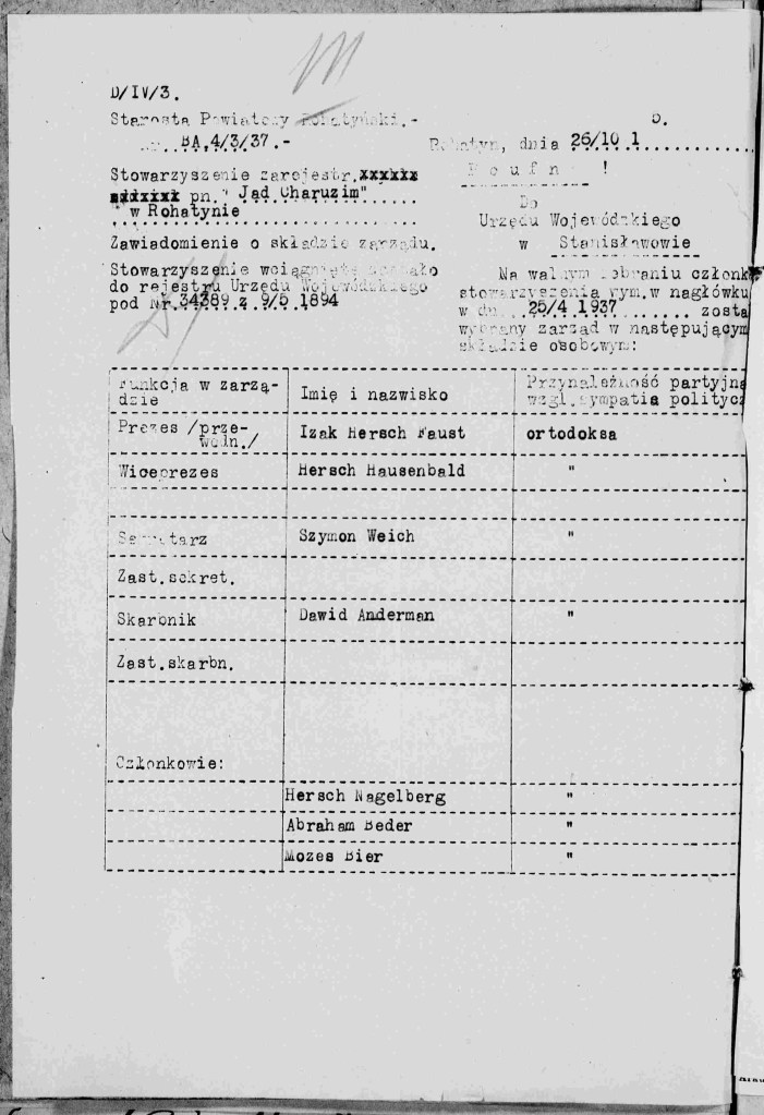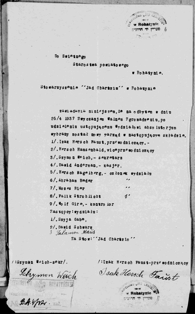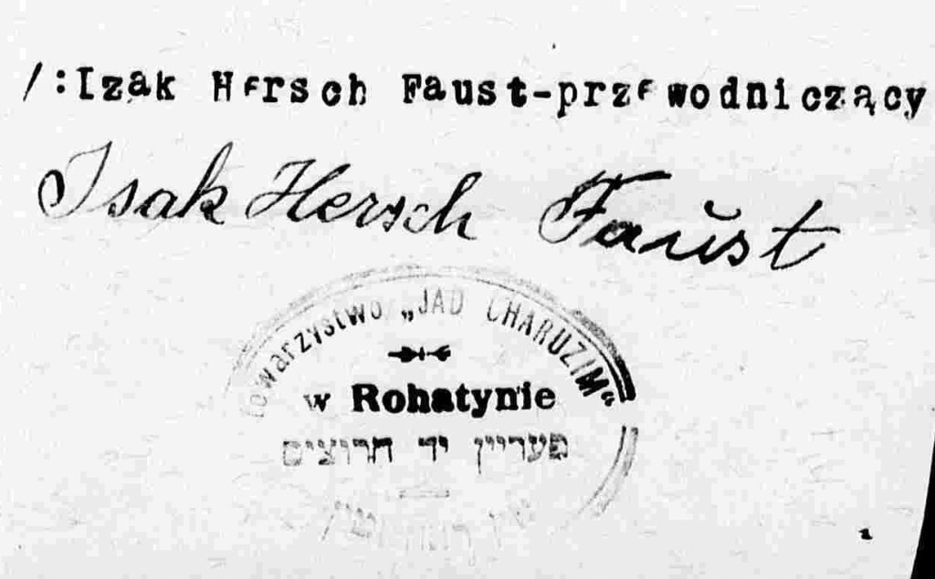 Naftali’s father was also involved in a organization in Rohatyn. On April 25, 1937, Izak Hersch Faust was elected president of the Rohatyn branch of Jad Charuzim, an association of Jewish craftsmen, which was originally established on May 9, 1894. The objectives of the society were to promote the education and knowledge of Jewish craftsmanship through workshops and free apprenticeships, provide grants and loans to small businesses, and support and care for sick members. In addition to Isak Hersch, the board consisted of Vice President Hersch Hausenbald, Secretary Simon Weich, and Treasurer David Anderman. Other members of the board included Hersch Nagelberg, Abraham Beder, Mozes Bier, and Falik Strohlicht. The auditor was Wolf Gire and deputy board members included Szyja Gabe, David Schwarz, and Salamon Maus. Board members served a term of three years. There were 18 members in the association and all were noted to be Orthodox. Meetings were held in a building owned by Izak Hersch on Cerkiewna Street in Rohatyn. The western end of Cerkiewna street starts on the bank of the Gnila Lipa River at the entrance of the Church of the Holy Spirit and runs east past the mikva and ends at the northwest corner of the central square in Rohatyn where the Eastern Orthodox Church is located. It was on this street that the original home of the Faust family, house number 98, was located before being destroyed during World War One. Original documents for the Jad Charuzim organization are located in the State Archive of Ukraine in Ivano-Frankivsk and have been microfilmed by the Center for the History of Jewish People and by the United States Holocaust Memorial and Museum.