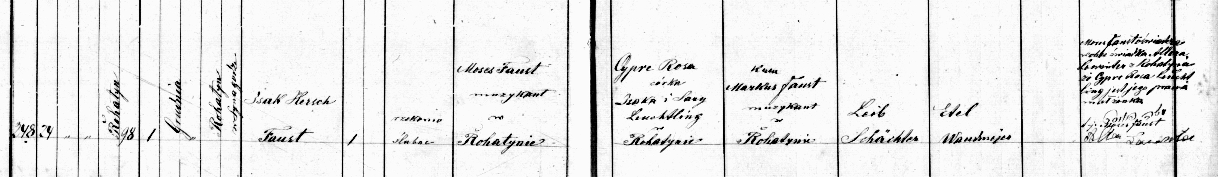 Izak Hersch Faust was born on Sunday, November 24, 1878 in house number 98 in Rohatyn to Moses Faust and Cypre Rosa Leuchtling with the assistance of midwife, Etel Wandmeyer. The parents were noted to be ‘supposedly married’ (rzekomo ślubne) thus the birth was given the benefit of the doubt on legitimacy and Isak Hersch was named with the Faust surname. Alter Lewinter attested to the marriage of Moses and Cypre Rosa and signed the birth record. Moses Faust signs his name twice, in Hebrew and in Latin letters. The brit milah ceremony was held the following Sunday on December 1st at the synagogue. Moses’s brother, Markus, a musician as well, was the Sandek, and Leib Schächter was the Mohel. Izak Hersch was named after his maternal grandfather, Izaak Hersch Leuchtling.