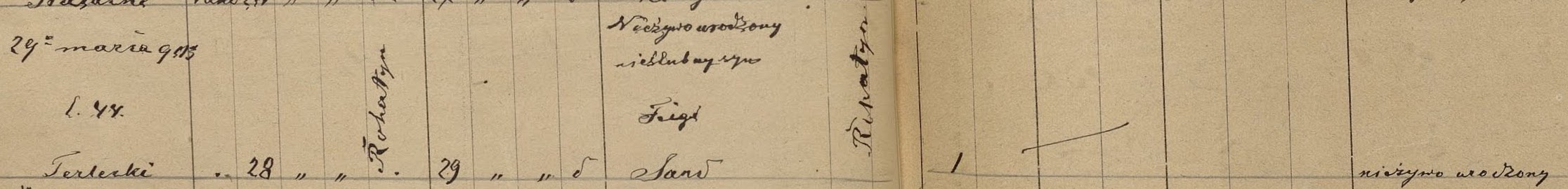 Prior to registering their marriage, Feige had delivered a male stillborn neonate with the assistance of midwife, Lea Barban. According to the birth record, the stillbirth was delivered on March 30, 1903. However, the death record for the stillborn states the death occurred March 28, 1903, two days earlier than what is recorded on the birth record. Dr. Terlecki certified the cause of death as stillborn (nieżywo urodzony) on March 29th, the date the stillborn was buried in Rohatyn. It interesting to note the difference in dates between these records. One would think that the recording of this event would have taken place on or very close to the date of the event as there would not be confusion. I am open to thoughts on the reason for this discrepancy.