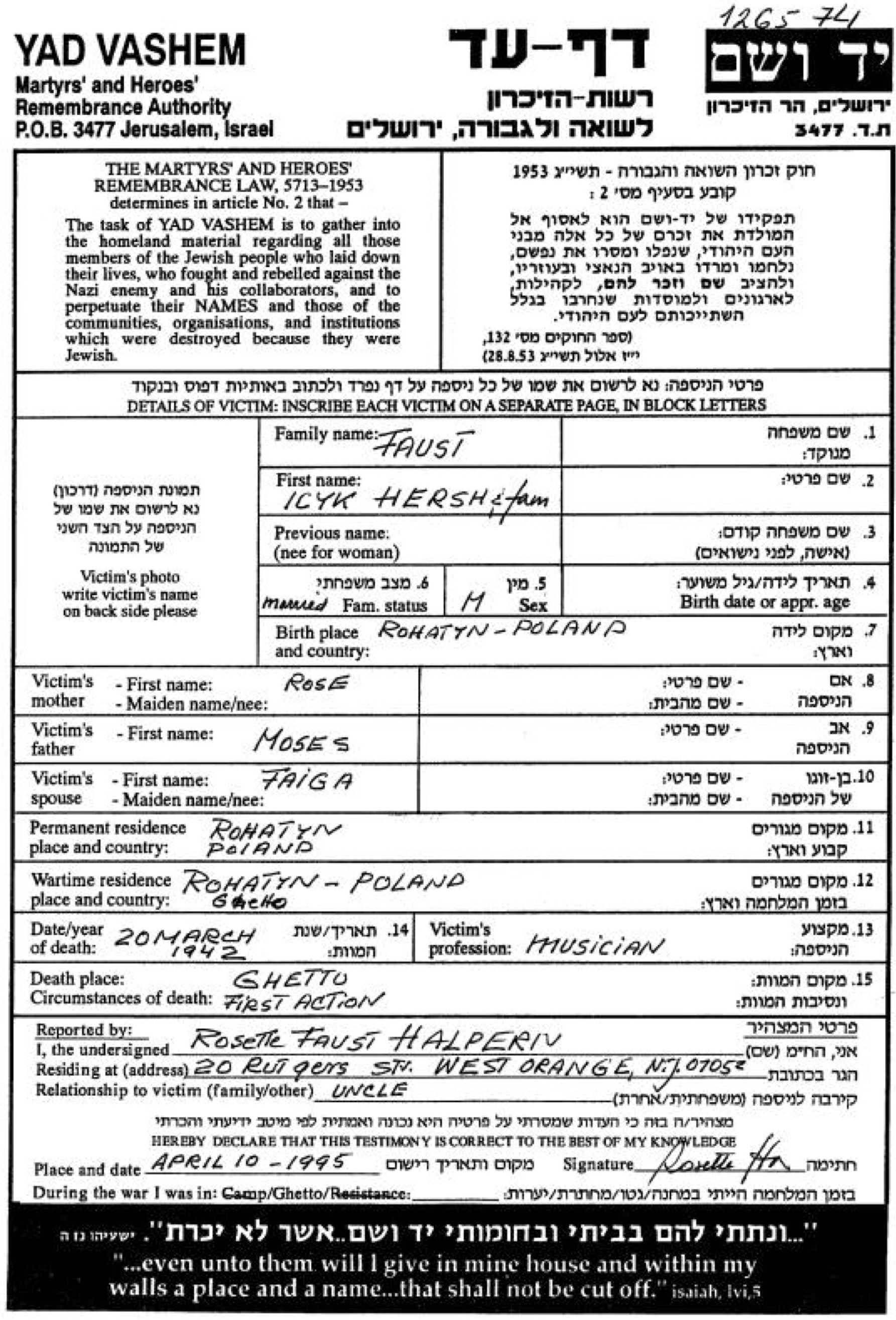FATE OF THE FAMILY OF IZAK HERSCH FAUST