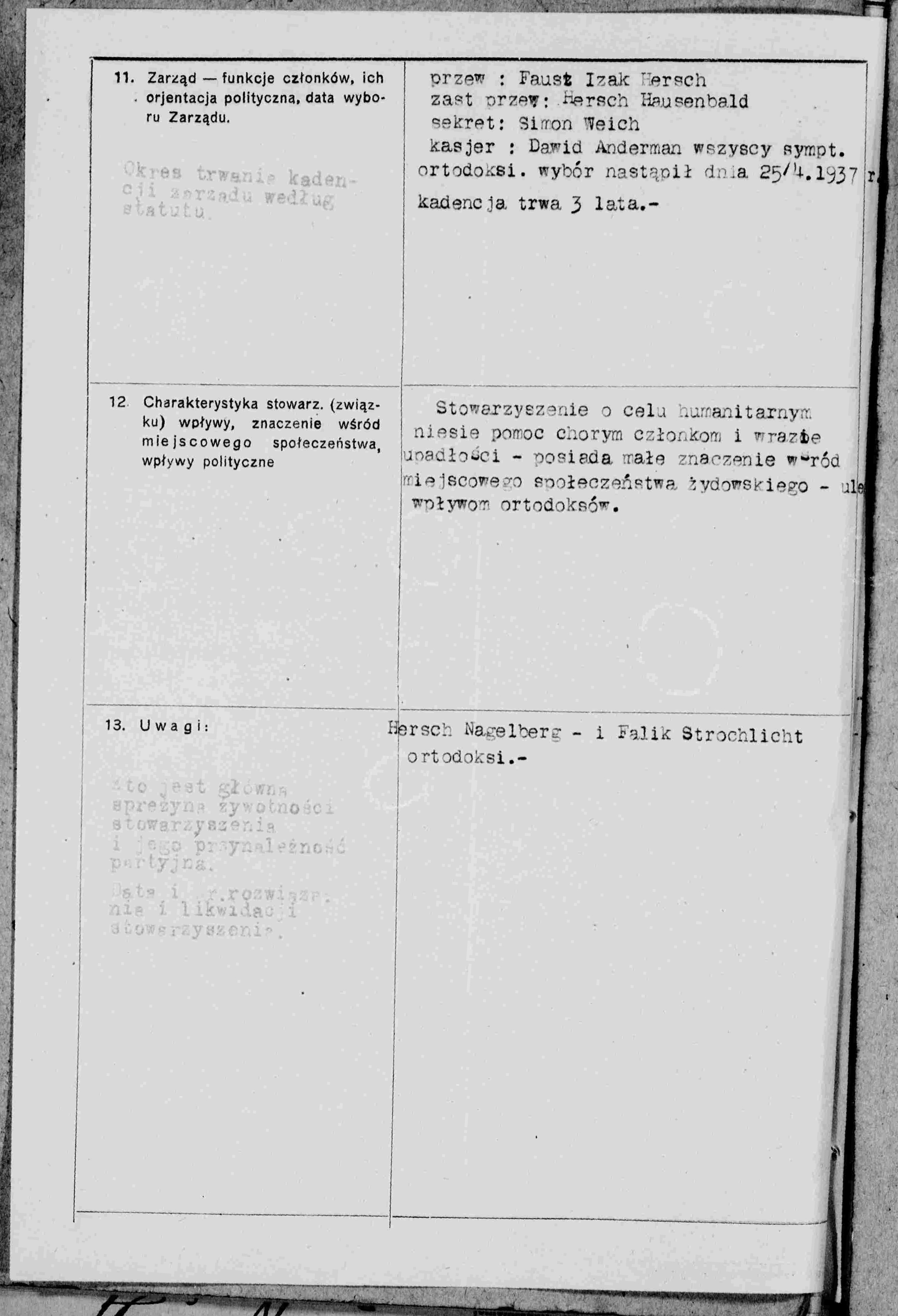 Naftali’s father was also involved in a organization in Rohatyn. On April 25, 1937, Izak Hersch Faust was elected president of the Rohatyn branch of Jad Charuzim, an association of Jewish craftsmen, which was originally established on May 9, 1894. The objectives of the society were to promote the education and knowledge of Jewish craftsmanship through workshops and free apprenticeships, provide grants and loans to small businesses, and support and care for sick members. In addition to Isak Hersch, the board consisted of Vice President Hersch Hausenbald, Secretary Simon Weich, and Treasurer David Anderman. Other members of the board included Hersch Nagelberg, Abraham Beder, Mozes Bier, and Falik Strohlicht. The auditor was Wolf Gire and deputy board members included Szyja Gabe, David Schwarz, and Salamon Maus. Board members served a term of three years. There were 18 members in the association and all were noted to be Orthodox. Meetings were held in a building owned by Izak Hersch on Cerkiewna Street in Rohatyn. The western end of Cerkiewna street starts on the bank of the Gnila Lipa River at the entrance of the Church of the Holy Spirit and runs east past the mikva and ends at the northwest corner of the central square in Rohatyn where the Eastern Orthodox Church is located. It was on this street that the original home of the Faust family, house number 98, was located before being destroyed during World War One. Original documents for the Jad Charuzim organization are located in the State Archive of Ukraine in Ivano-Frankivsk and have been microfilmed by the Center for the History of Jewish People and by the United States Holocaust Memorial and Museum.